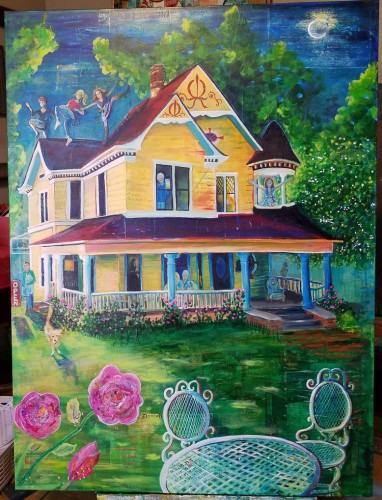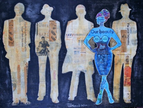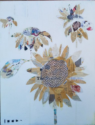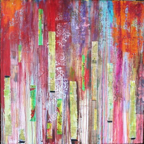I utilize a mixed medium that incorporates acrylics and vintage images, stamps, old magazines, sheet music, hymnals, bibles, hand written letters, recipes, candy wrappers, labels, books, well, almost anything really. My intention is to build up texture, depth and nuances that require study of the piece. I like for my art to conjure up good feelings or happy memories. I love the element of surprise when someone sees something in a piece that they didn't see upon first viewing. Depending on the project and time limitations, my art usually sits in my studio for a while before I put it "out there". I let marks, spills, and scratches happen. I drip and splatter paint, sometimes covering up parts, and sometimes wiping them away and later even sanding them away, excited to see what re-emerges. Once I am inspired to do a painting, or series, I begin, but not always having a clear picture of the final image, because as I go, sometimes it takes on a direction of its own.